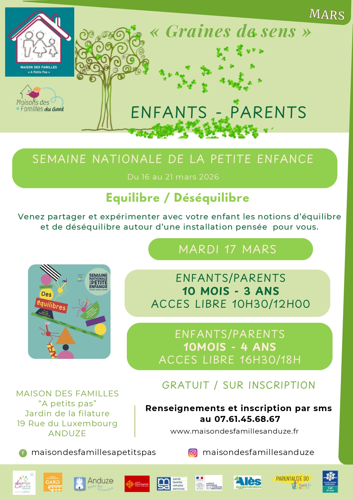 Atelier Enfants Parents Semaine nationale de la petite enfance Equilibre déséquilibre + Ajouter à mon Agenda Google + iCal / Outlook export 00 jours 00 heures 00 minutes 00 secondes Date 17 Mar 2026 Heure 10h30 - 0h00 Catégorie Espace lien enfants – parents Maison des Familles Partagez cet événement Rechercher : Articles récents Newsletter Février 2026 Newsletter Janvier 2026 Espace de ressources individuelles / Accompagnement Individuel Parentalité Espace Information Espaces de ressources individuelles / consultations Commentaires récents