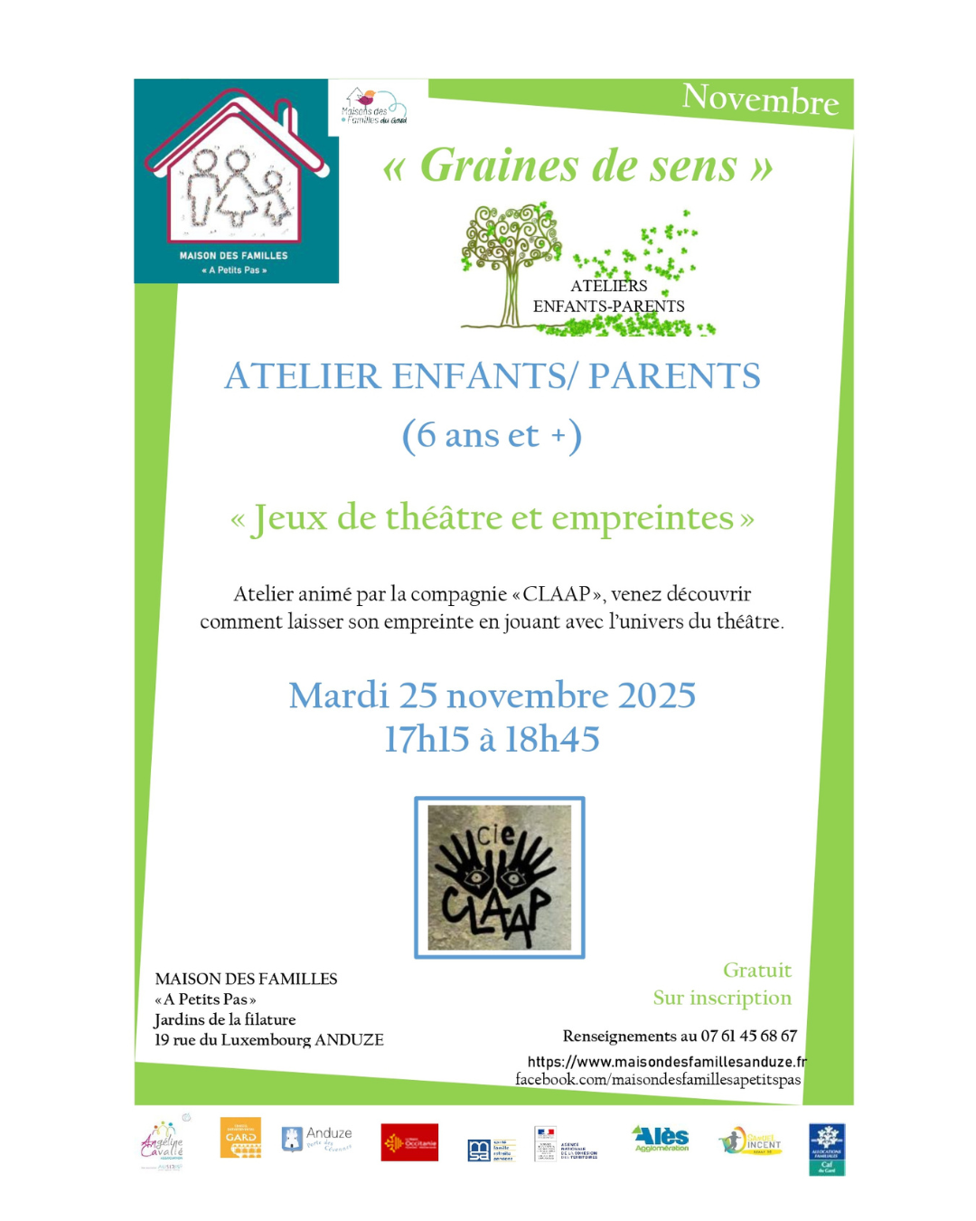 Atelier enfants parents (6 ans et +) « Jeux de théâtre et empreintes » avec CLAAP + Ajouter à mon Agenda Google + iCal / Outlook export 00 jours 00 heures 00 minutes 00 secondes Date 25 Nov 2025 Heure 17h15 - 18h45 Lieu Les Jardins de la Filature Bat D 19 rue du Luxembourg 30140 Anduze Catégorie Espace lien enfants – parents Partagez cet événement Rechercher : Articles récents Newsletter novembre 2025 Espace de ressources individuelles / Accompagnement Individuel Parentalité Espace Information Espaces de ressources individuelles / consultations Espace de ressources individuelles / Planning Familial 30 Commentaires récents