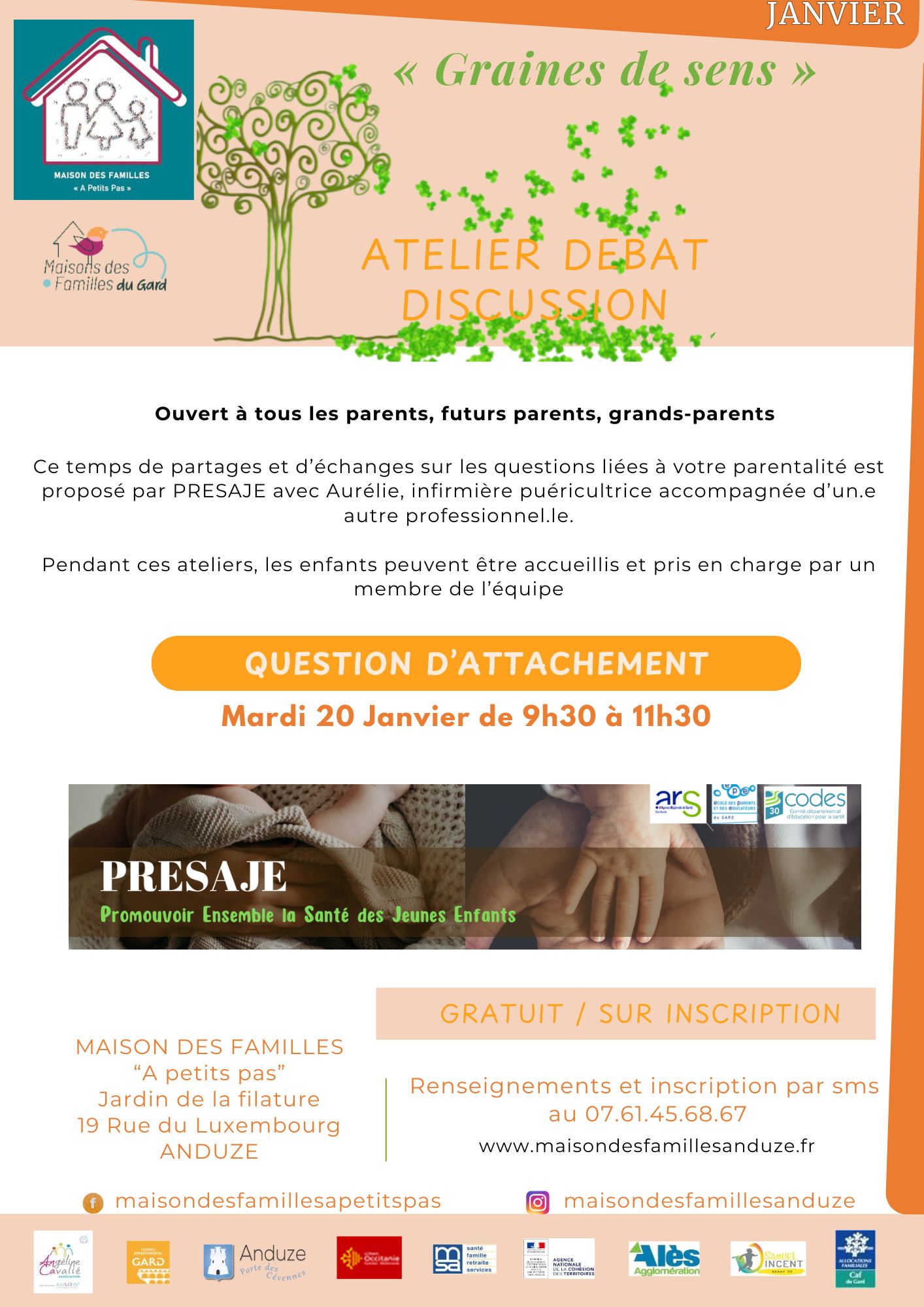 Atelier pour les parents « l’attachement » Animé par PRESAJE ATELIER POUR LES PARENTS «Question d’attachement» + Ajouter à mon Agenda Google + iCal / Outlook export 00 jours 00 heures 00 minutes 00 secondes Date 20 Jan 2026 Heure 9h30 - 11h30 Catégorie Espace lien enfants – parents Espace Soutien à la parentalité Maison des Familles Partagez cet événement Rechercher : Articles récents Newsletter Janvier 2026 Newsletter de décembre 2025 Espace de ressources individuelles / Accompagnement Individuel Parentalité Espace Information Espaces de ressources individuelles / consultations Commentaires récents