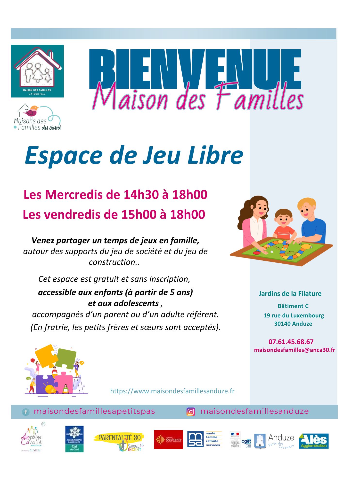Espace Jeu Libre La maison des familles vous invite à partager un moment convivial autour du jeu. + Ajouter à mon Agenda Google + iCal / Outlook export 00 jours 00 heures 00 minutes 00 secondes Date 24 Avr 2026 Heure 15h00 - 18h00 Lieu Les Jardins de la Filature Bat D 19 rue du Luxembourg 30140 Anduze Catégorie Maison des Familles Partagez cet événement Rechercher : Articles récents Newsletter Avril 2026 Espace de ressources individuelles / Accompagnement Individuel Parentalité Espace Information Espaces de ressources individuelles / consultations Espace de ressources individuelles / Planning Familial 30 Commentaires récents