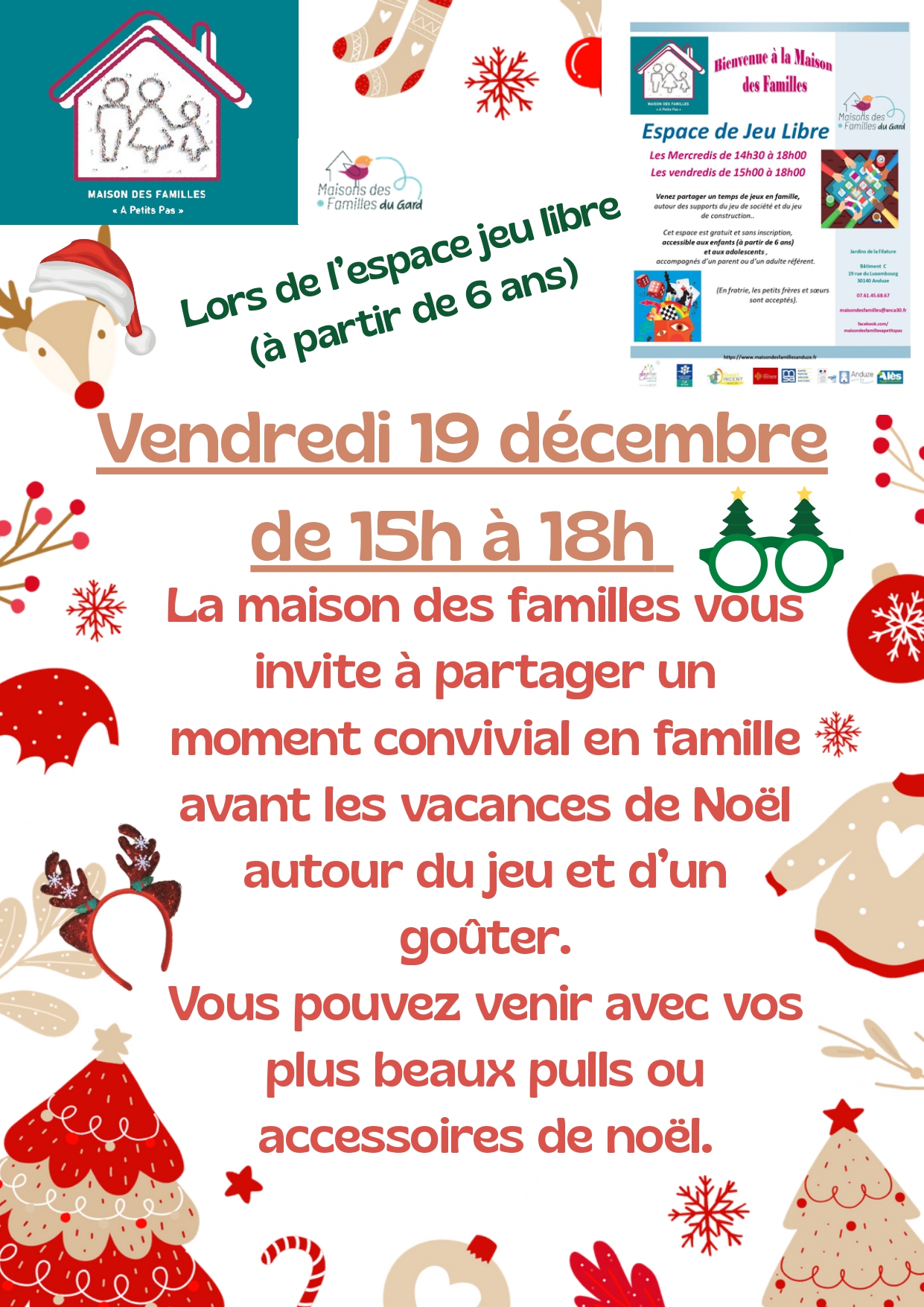 Espace Jeu Libre La maison des familles vous invite à partager un moment convivial autour du jeu. + Ajouter à mon Agenda Google + iCal / Outlook export 00 jours 00 heures 00 minutes 00 secondes Date 19 Déc 2025 Heure 15h00 - 18h00 Lieu Les Jardins de la Filature Bat D 19 rue du Luxembourg 30140 Anduze Catégorie Maison des Familles Partagez cet événement Rechercher : Articles récents Newsletter de décembre 2025 Espace de ressources individuelles / Accompagnement Individuel Parentalité Espace Information Espaces de ressources individuelles / consultations Espace de ressources individuelles / Planning Familial 30 Commentaires récents