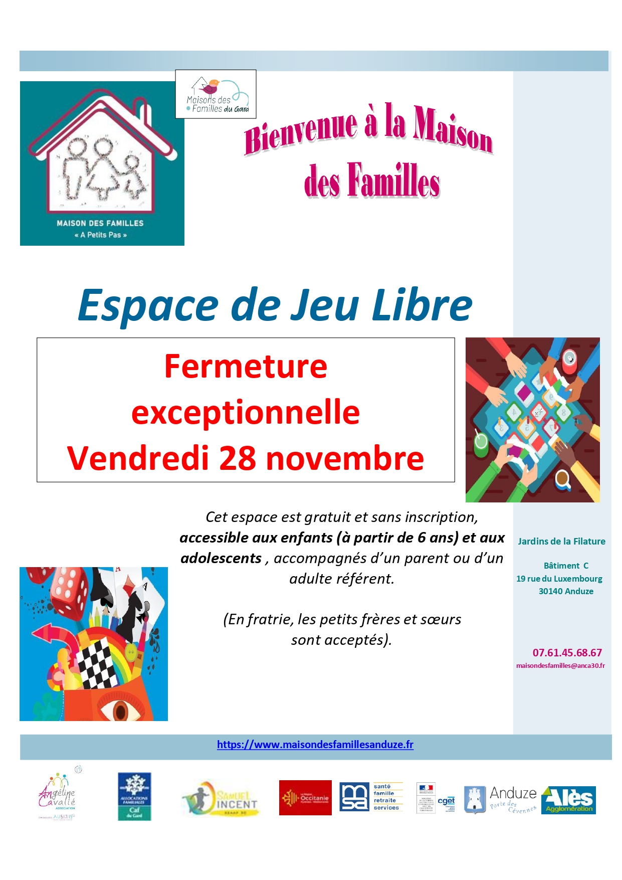 Fermeture de l’espace Jeu Libre + Ajouter à mon Agenda Google + iCal / Outlook export 00 jours 00 heures 00 minutes 00 secondes Date 28 Nov 2025 Heure 15h00 - 18h00 Catégorie Espace lien enfants – parents Maison des Familles Partagez cet événement Rechercher : Articles récents Newsletter novembre 2025 Espace de ressources individuelles / Accompagnement Individuel Parentalité Espace Information Espaces de ressources individuelles / consultations Espace de ressources individuelles / Planning Familial 30 Commentaires récents
