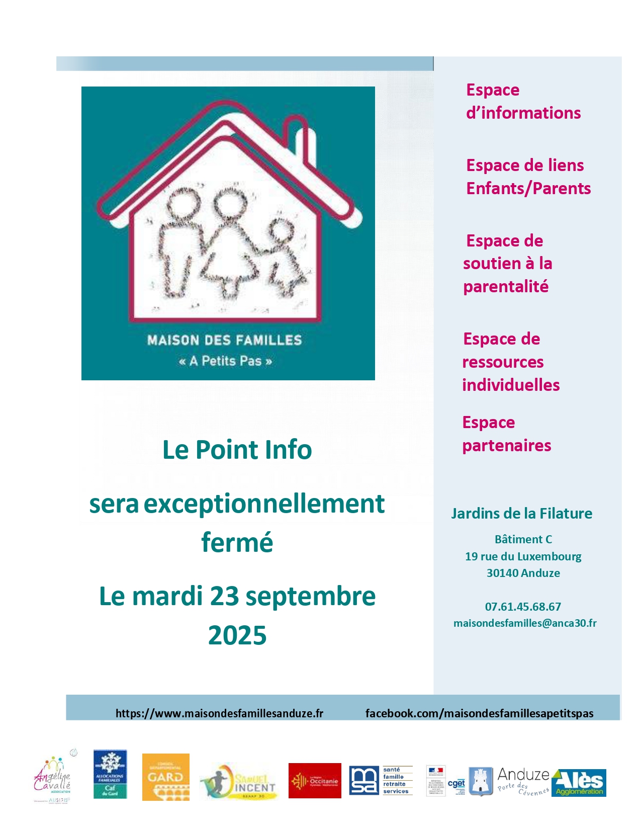 Fermeture Point infos + Ajouter à mon Agenda Google + iCal / Outlook export Date 23 Sep 2025 Expired! Heure 9h00 - 13h00 Lieu Les Jardins de la Filature Bat D 19 rue du Luxembourg 30140 Anduze Catégorie Espace Information Partagez cet événement Rechercher : Articles récents Newsletter Février 2026 Newsletter Janvier 2026 Espace de ressources individuelles / Accompagnement Individuel Parentalité Espace Information Espaces de ressources individuelles / consultations Commentaires récents