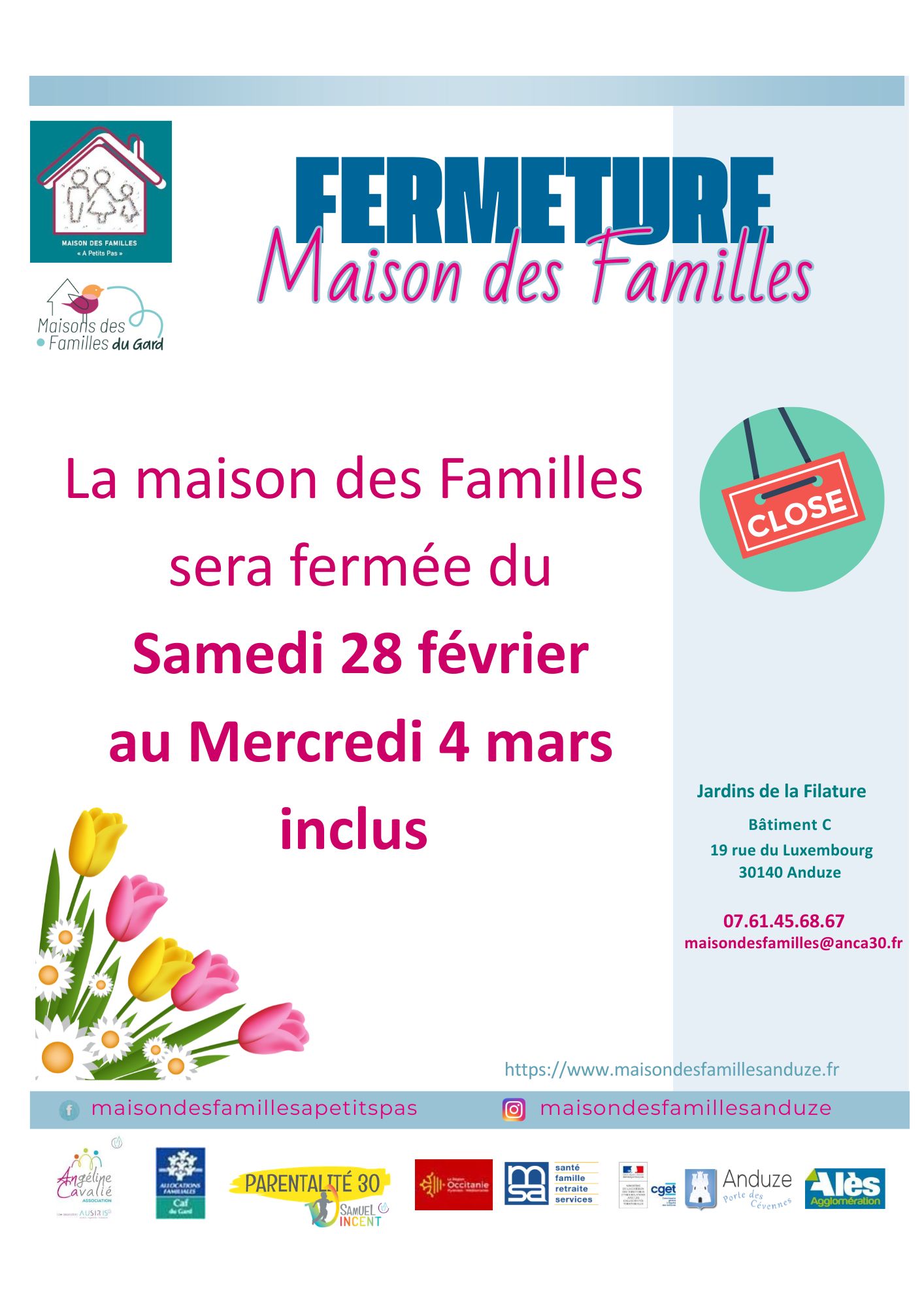 Fermeture La maison des familles sera fermée du samedi 28 février au mercredi 4 mars inclus + Ajouter à mon Agenda Google + iCal / Outlook export Date 28 Fév 2026 - 04 Mar 2026 Expired! Heure All Day Catégorie Maison des Familles Partagez cet événement Rechercher : Articles récents Newsletter Avril 2026 Espace de ressources individuelles / Accompagnement Individuel Parentalité Espace Information Espaces de ressources individuelles / consultations Espace de ressources individuelles / Planning Familial 30 Commentaires récents