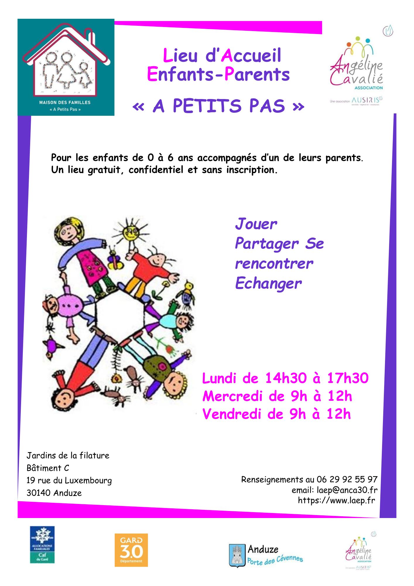 LAEP Lieu d’Accueil Enfants Parents + Ajouter à mon Agenda Google + iCal / Outlook export 00 jours 00 heures 00 minutes 00 secondes Date 04 Fév 2026 Heure 9h00 - 0h00 Lieu Les Jardins de la Filature Bat D 19 rue du Luxembourg 30140 Anduze Catégorie Espace lien enfants – parents Maison des Familles Partagez cet événement Rechercher : Articles récents Newsletter Janvier 2026 Newsletter de décembre 2025 Espace de ressources individuelles / Accompagnement Individuel Parentalité Espace Information Espaces de ressources individuelles / consultations Commentaires récents